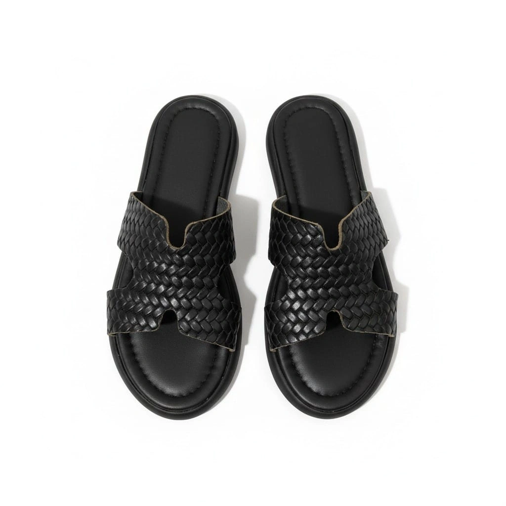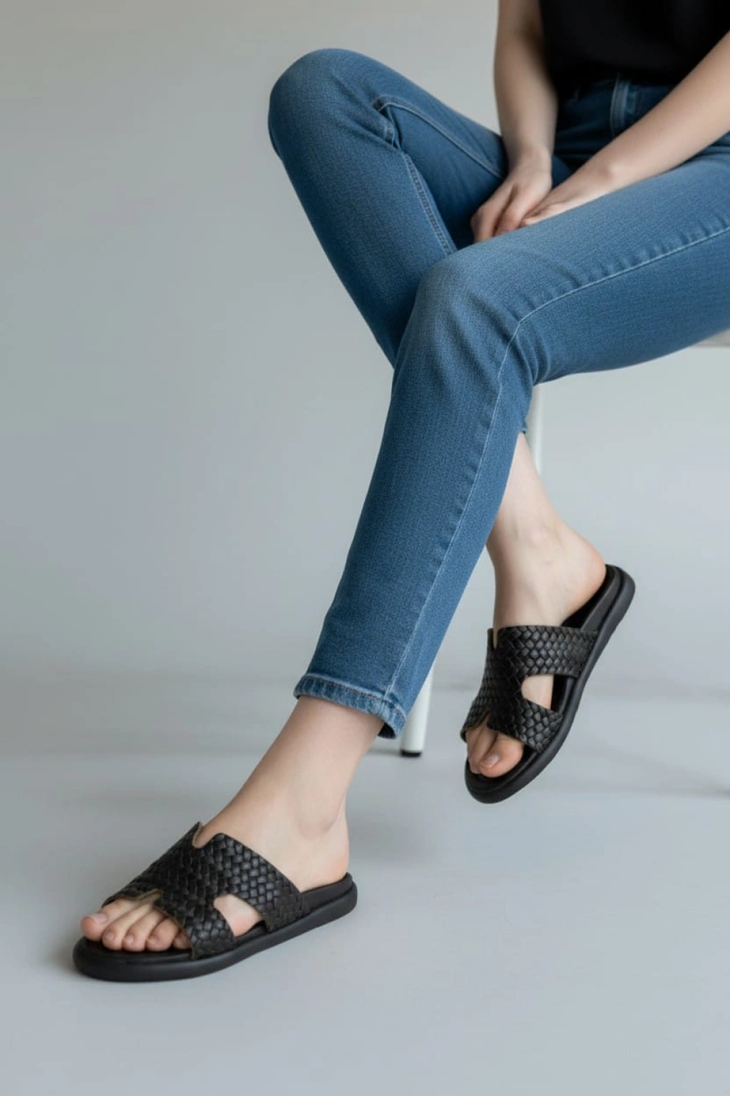 EFW %100 Hakiki Deri Siyah Çapraz Saç Örgülü Kadın Sandalet
