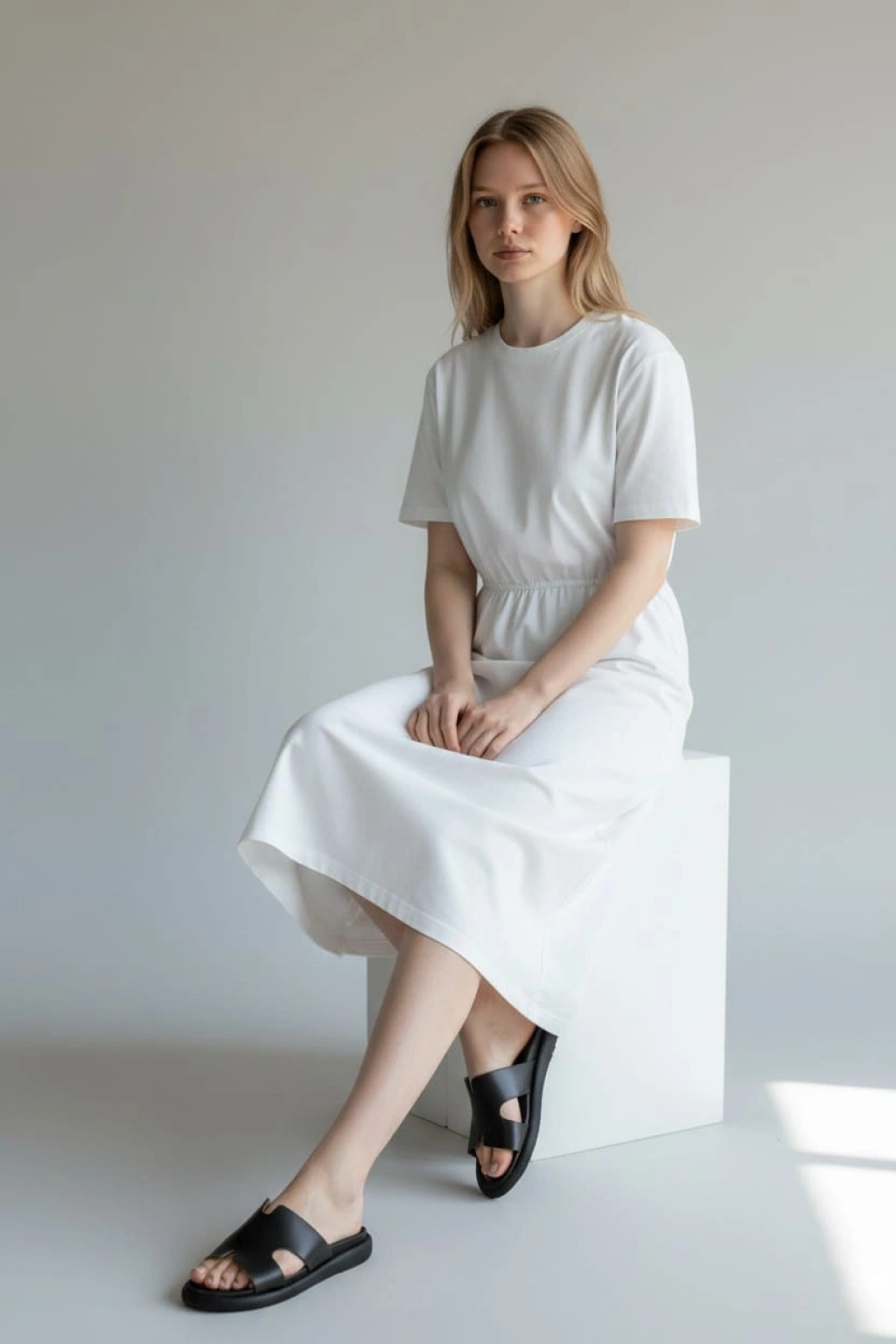 EFW %100 Hakiki Deri Beyaz Kadın Tek Bant Sandalet