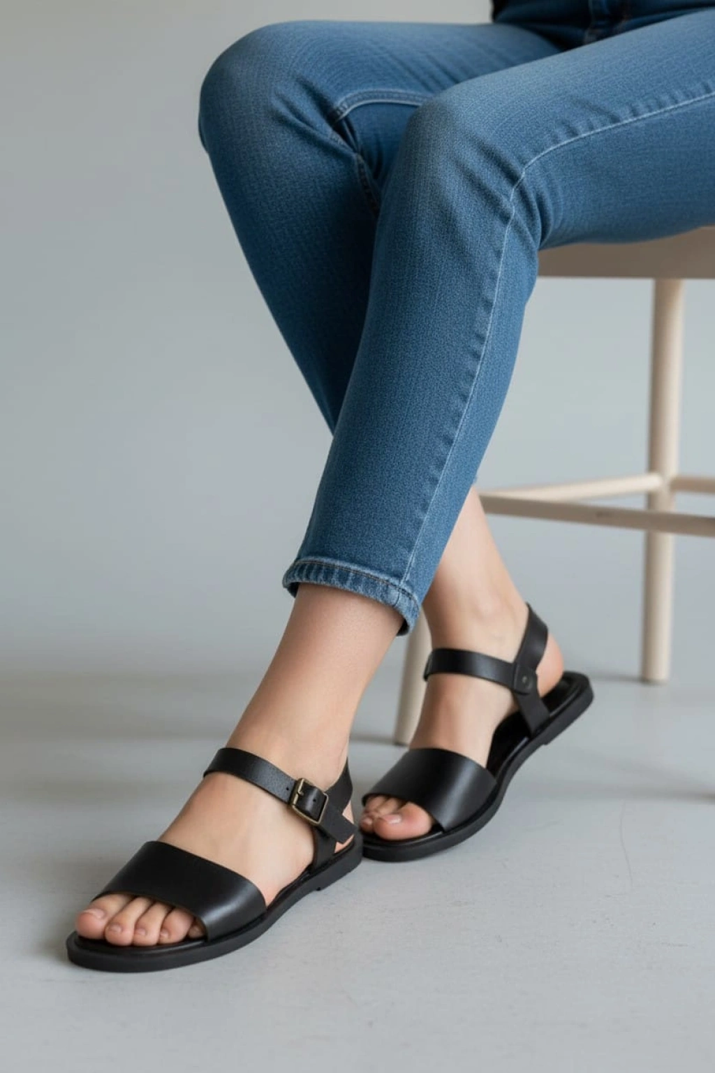 EFW %100 Hakiki Deri Siyah Kalın Tek Bant Kadın Sandalet