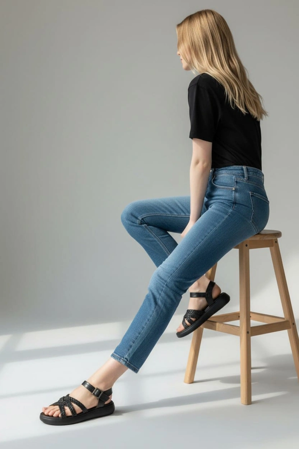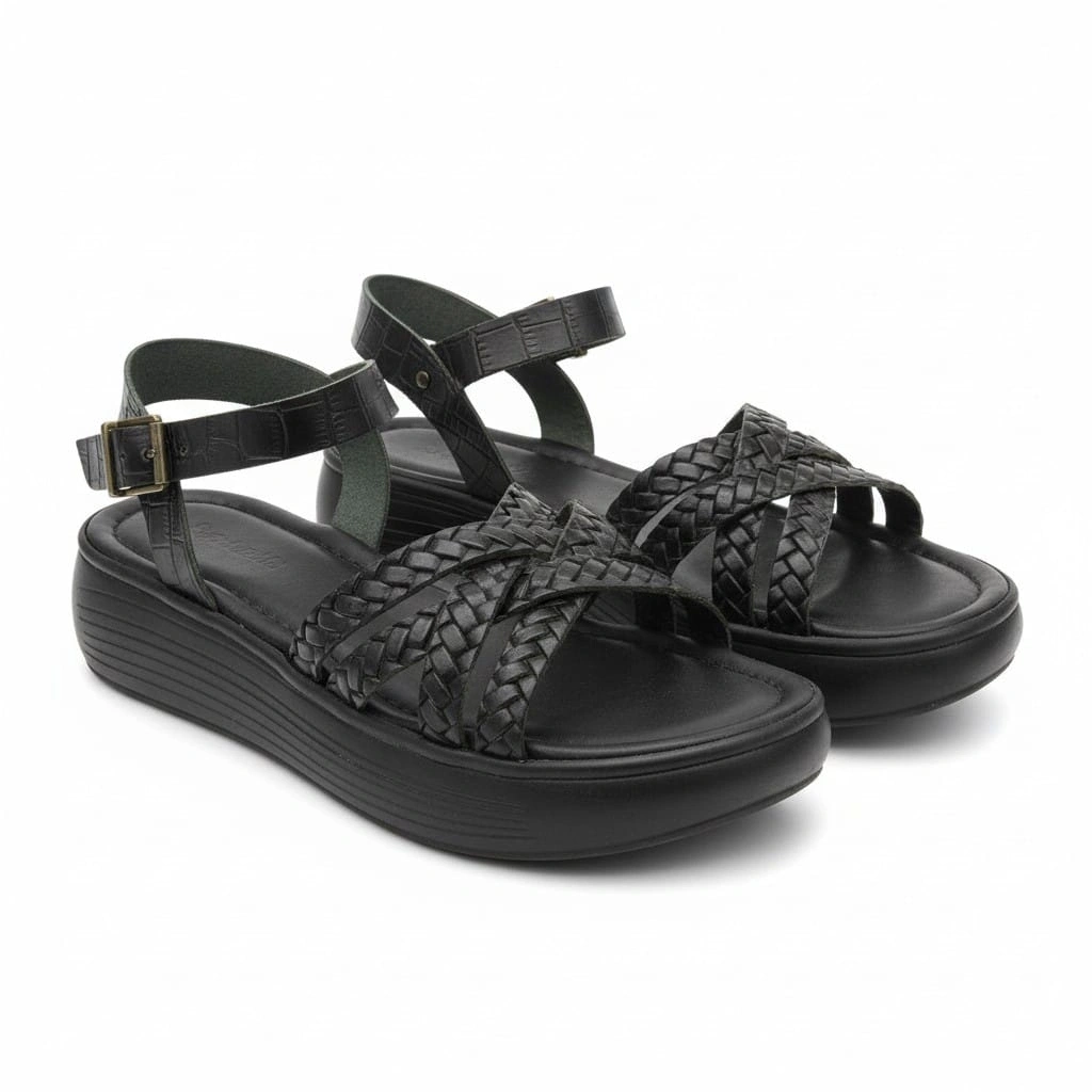 EFW %100 Hakiki Deri Siyah Çapraz Saç Örgülü Kadın Sandalet