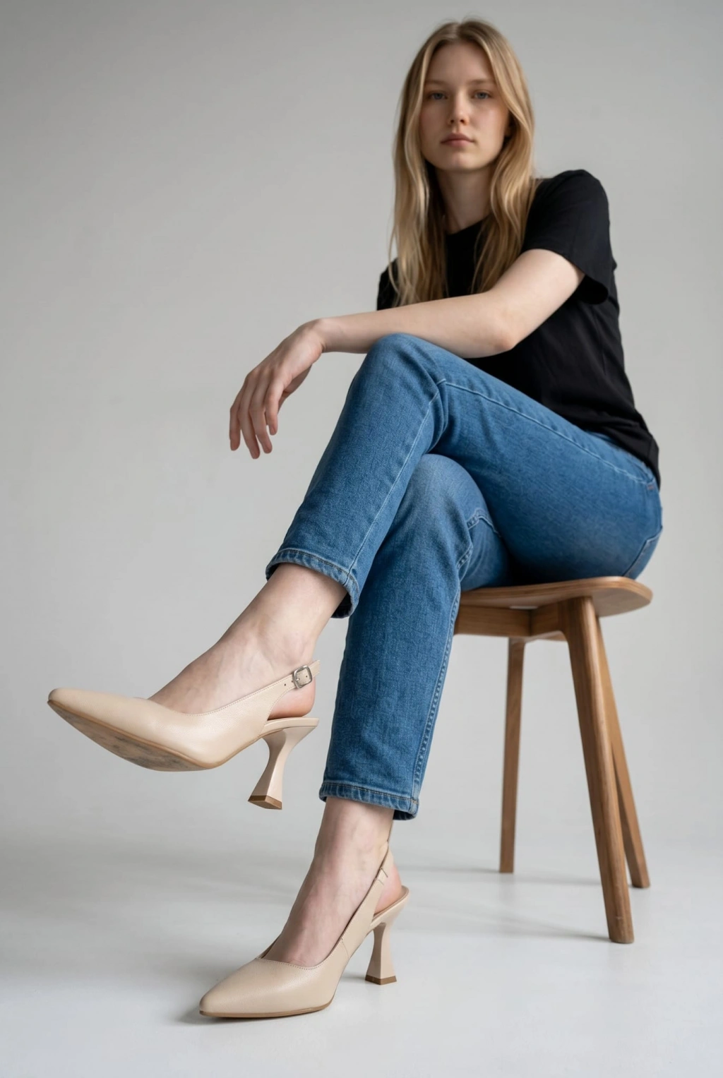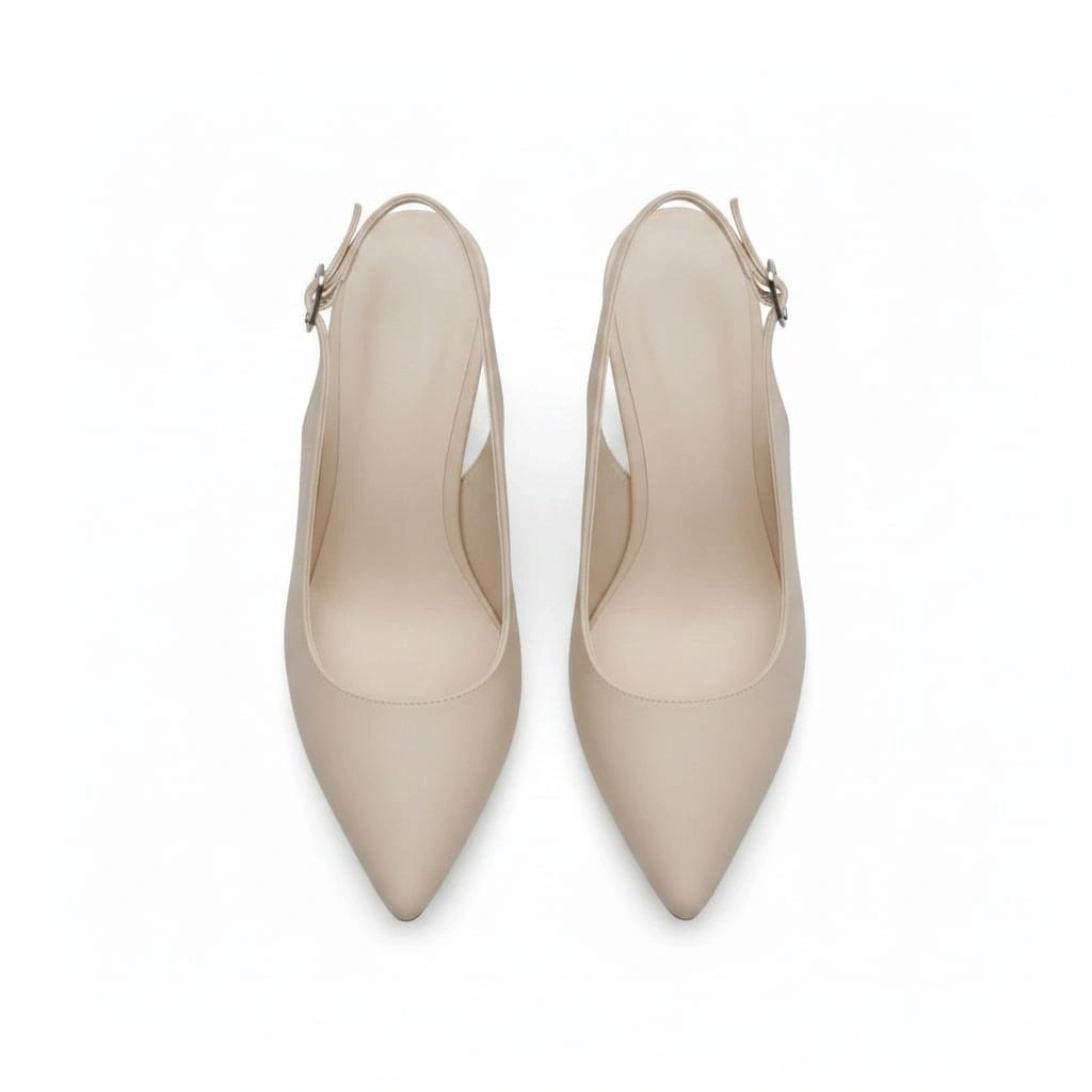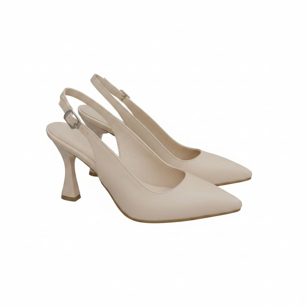 Bej Deri Sivri Burun Arka Açık Topuklu Kadın Ayakkabı
