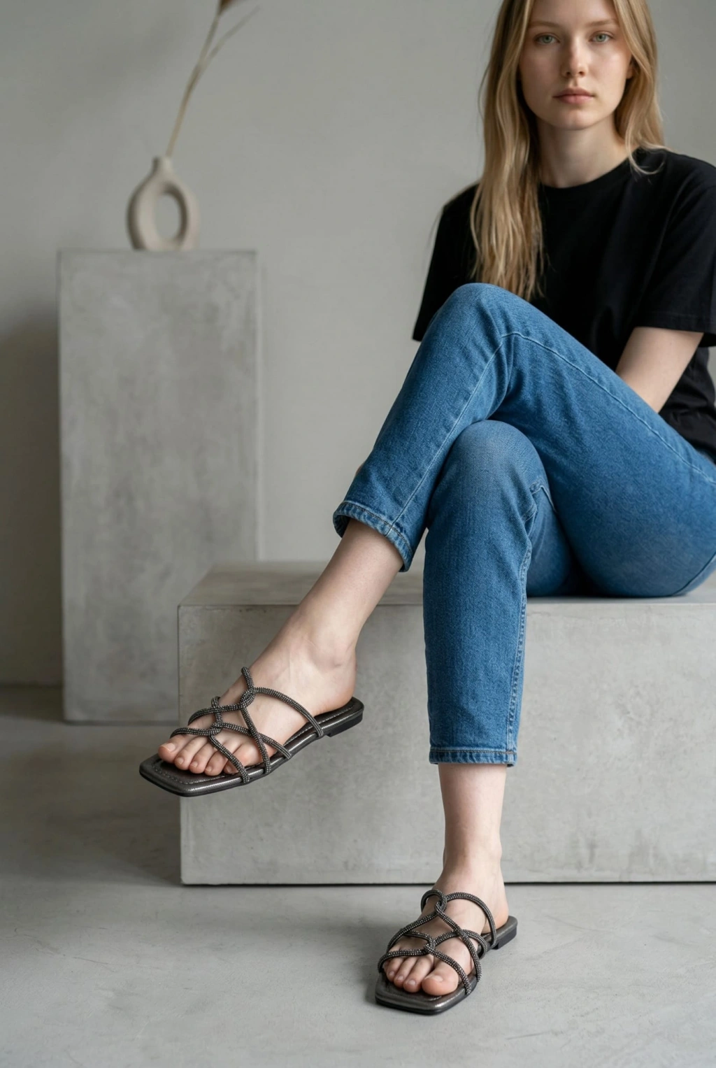EFW %100 Hakiki Deri Siyah Çapraz Saç Örgülü Kadın Sandalet